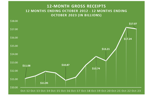 Gross Receipts for the last 12 months of $17.07 billion are $167 million, or 1 percent, below revenues from the previous year. Impacted by reduced oil and gas revenue, October marks the first time since March 2021 that receipts to the Treasury fell below the prior year’s 12-month revenue as expected.