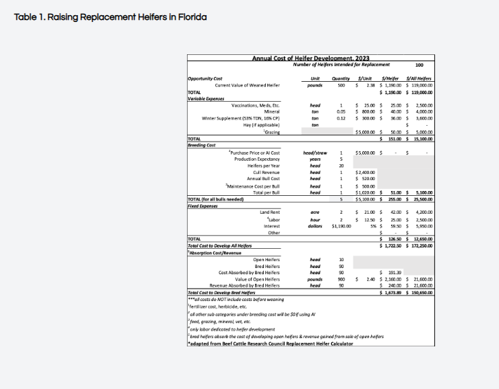 As an example, current prices for weaned heifers in Florida have been well above $2.00 per lb. since April 2023 and are continuing to rise. Prices for replacement cattle, open or bred, can be expected to follow the same trend in Florida as the demand for and value of replacement cattle increases when expansion begins to occur. Understanding the full cost to develop heifers allows you to compare that cost to selling heifers at weaning and buying bred replacements. If the price of bred heifers is greater than the total cost to develop bred heifers, a potentially profitable investment has been made in your heifers. Of course, also important to the decision is your strategy for genetic development, which must be weighed against the value of weaned heifers, development costs, and the cost of purchased replacements. These decisions are all about the goals and risk management strategies of each operation. According to the example in Table 1, the total cost to develop 100 heifers is $172,250 or $1,722.5/hd. However, after considering the revenue of selling 10 open culls, the net development cost is reduced to a total of $150,650 or $1,673.89/hd for each of the remaining 90 bred heifers. The current value of young, bred replacement cattle with an average weight of 1,100 pounds is $1.54 per lb. or roughly $1,700/hd in Florida. Using the results of the example, you would save approximately $27/hd or a total of $2,430 if you raised your replacements (90) rather than buying them. Even though the price you would have received for selling weaned heifers is higher than the cost of development, the long-term outcome in this scenario suggests that the cost of development was worth the investment. With the value of female cattle expected to rise in the coming months due to inevitable expansion, raising your own replacements to rebuild your herd may be a more economical decision. Expenses can be overwhelming when looked at as a short-term lump sum. So, it is important to look at them as long-term investments when possible. To download the Replacement Heifer Cost Estimation Tool click here. The file will be located under ‘calculators’.