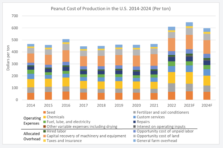 In a Southern Ag Today article on December 4, 2023, it was shown that peanut prices are continuing to rise since the low in 2015. It was noted that the USDA expects prices to be about $550/ton for the 2023-2024 marketing year. This is still below the cost of production shown above.