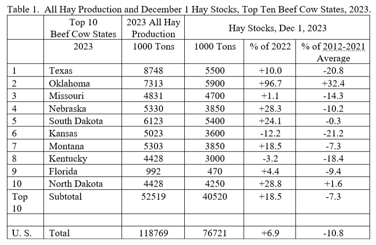 Table 1 shows the hay situation for the ten largest beef cow states.  These states account for 57.8 percent of the total beef cow inventory in 2023 and represent nine of the top ten states for December 1 hay stocks.  Hay stocks in the top ten beef cow states were up 18.5 percent year over year but were 7.3 percent below the 2012-2021 average for these states.   Total December 1 hay stocks in these states represented 52.8 percent of total U.S. hay stocks.  Table 1 shows that hay stocks were higher year over year in eight of the ten states, with decreases only in Kansas and Kentucky.  Among the top ten states, Oklahoma stands out with December 1 hay stocks up 96.7 percent year over year and 32.4 percent higher than the ten-year average.  Oklahoma had 2023 hay production up 88.0 percent year over year and up 36.8 percent over the 2012-2021 average.  Oklahoma and North Dakota were the only top ten beef cow states with December 1 hay stocks that were larger than the ten-year average.
