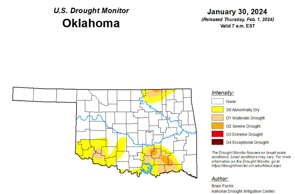 According to the latest Oklahoma drought monitor report, exceptional drought remains at zero percent, unchanged from the start of the calendar year.