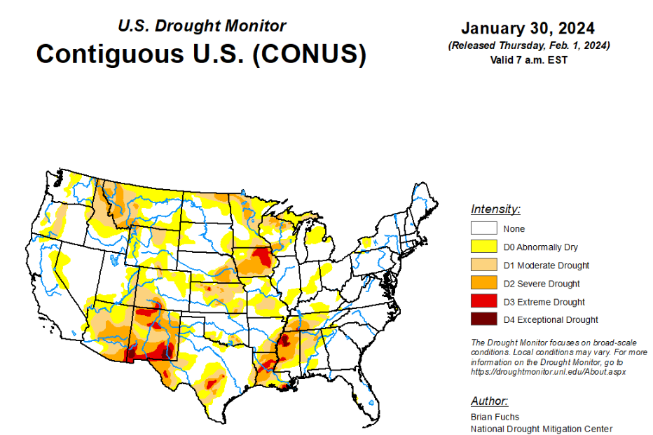 According to the latest U.S. Drought Summary, the synoptic pattern over the last week favored continued precipitation over the coastal areas of the Pacific Northwest and very widespread and heavy precipitation in the South and Southeast and into the Midwest. Some areas of east Texas, Louisiana and Mississippi recorded over 8 inches of rain for the week. Dryness dominated the central to high Plains and most of the rest of the West as well as the Atlantic Coast into south Florida. After a very strong cold snap in previous weeks, temperatures this week were warmer than normal over much of the U.S., with the upper Midwest having the greatest departures of 15-20 degrees above normal in Minnesota and northern Wisconsin. Across the plains of Wyoming and Montana and into the northern Rocky Mountains, there is building concern over the lack of snow this current water year and snow drought concerns are also prevalent in portions of the High Plains and upper Midwest.