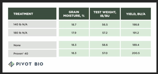 Preston employs both no-till and cover crop practices in addition to Pivot Bio’s microbial nitrogen. The study showed an average corn yield of 195 bushels per acre across nitrogen rates, and plots treated with PROVEN 40 yielded an average of 11 bushels per acre more than the control plots.