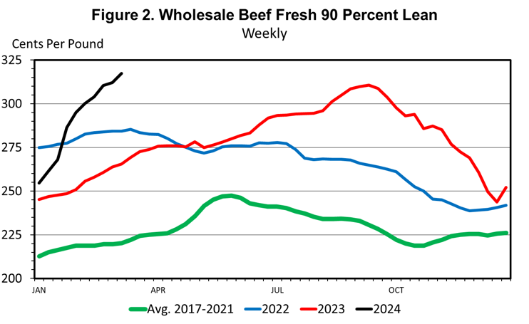 Slaughter cow prices are driven by the price of 90 percent lean beef trimmings (90s), which posted a price of $317.36/cwt. the first week of March. This is a record high price for 90s in data back to 1978 and undoubtedly an all-time record weekly price. The supply of nonfed beef (cow + bull) is down 12.7 percent year over year thus far in 2024, the result of a 13.1 percent year-to-date decrease in cow slaughter. Dairy cow slaughter is down 15.0 percent and beef cow slaughter is down 11.4 percent year over year, while bull slaughter so far in 2024 is down 9.4 percent from one year ago.