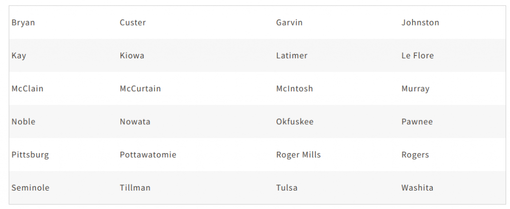 Primary Counties Eligible: Atoka, Beckham, Choctaw, Coal, Greer, Harmon, Hughes, Jackson, Osage, Pontotoc, Pushmataha, and Washington