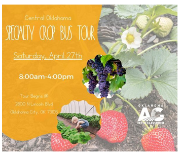 We will be sending out a detailed schedule a week before the tour, but you will need to meet the bus the morning of the tour at the Oklahoma Department of Agriculture, Food, and Forestry (address below). Please arrived between 7:40 – 7:55 am. The bus will leave promptly at 8:00 am. Restrooms will be available at ODAFF that morning, but only if you arrive by 7:55 am! 🙂Â