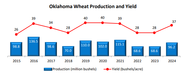 Marshall says USDA sees a 96.2 million bushel wheat crop for 2024 in Oklahoma- up 40% from a year ago. That’s based on 2.6 million acres that they believe will be harvested a May first estimated 37 bushels per acre average. That compares to 68.6 million bushels produced in 2023.