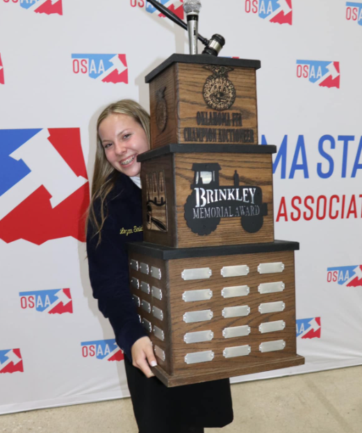 The trophy is designed for 60 years of winners’ names to be engraved. Several members of the Brinkley family were present to watch Larry Brinkley be honored. Larry Brinkley‘s name will be honored across Oklahoma in every FFA chapter. The winner of the contest was 14 years old. If you have a child in FFA interested in learning how to auctioneer, please reach out, and I will give you instructions. I’m currently training two young auctioneers from our area in hopes of bringing the Larry Brinkley Award home to McCurtain County next year”