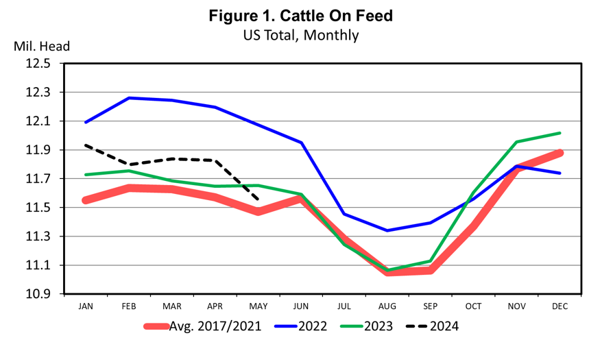 The latest USDA Cattle on Feed report pegged May 1 feedlot inventories at 11.554 million head, down 0.9 percent from one year ago. This is the first year over year decrease in feedlot inventories in eight months (Figure 1). Feedlots typically see a consistent seasonal pattern in inventories with peaks in the November to February period and summer lows in July-September. The average seasonal decrease from peak to trough has averaged just under 900,000 head in the past five years. The May 1 inventory is down 462,000 head from the recent December 2023 peak. Feedlot inventories are expected to decrease seasonally for another three months or so, but the more important question may be the extent to which feedlot inventories will increase for the next seasonal peak.