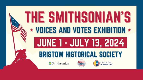 This summer the Bristow Historical Society is a host site for the Smithsonian’s Voices and Votes: Democracy in American exhibition! Voices and Votes is part of Museum on Main Street, a collaboration between the Smithsonian Institution and the Oklahoma Humanities. Bristow is one of only six Oklahoma locations to be selected for this program. Most of the Bristow Historical Society’s displays have been taken down and packed up to make room for this dynamic exhibition, which will feature photos, videos, multimedia interactives with short games. The exhibition will showcase historical objects like campaign souvenirs, voter memorabilia, and protest material. It is the goal of this major Smithsonian exhibition to engage the community and remind each citizen of the importance of voting, one of the greatest responsibilities of all Americans. From the revolution and suffrage to civil rights and casting ballots, everyone in every community is part of this ever-evolving story – the story of democracy in America.