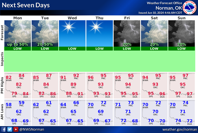 Below, see the 7-day forecast provided by the Oklahoma Mesonet. No storm alert advisories for the week were published at the time of this report.