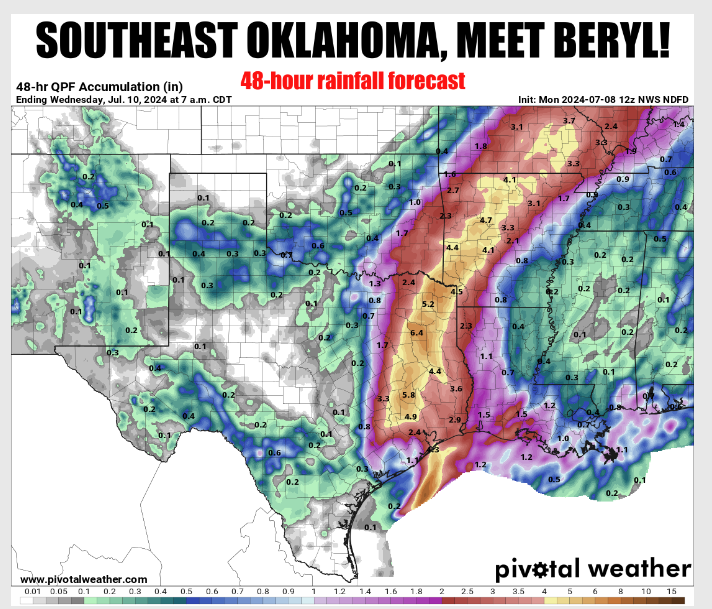 As Hurricane Beryl travels across the Texas Gulf Coast, it may also provide some drought-busting moisture for Oklahoma. According to State climatologist Gary McManus, It will probably go just to their southeast, so southeast of southeast Oklahoma. However, it should still provide ample rainfall to just about the last part of the state that needed a good dose. Up to 4-6 inches are being forecast, but that could go up a bit in localized areas, and there’s also a wind advisory for a bit of that spin left.”