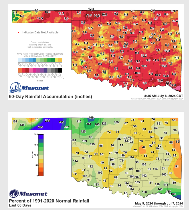 McManus says with flash drought starting to pop up throughout Oklahoma this Rainfall will be helpful, “The rainfall from Beryl will complete a magnificent reversal of fortune for a state that was headed for some serious drought with flash drought spreading over the last 60 days.”
