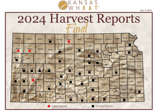 With harvest down to the final few days, this will be the last report for the 2024 Kansas wheat harvest. Rain delays continue to stretch out the season, but producers welcome the moisture as they turn their attention to planting fall crops and managing the weeds coming up rapidly in wheat stubble.