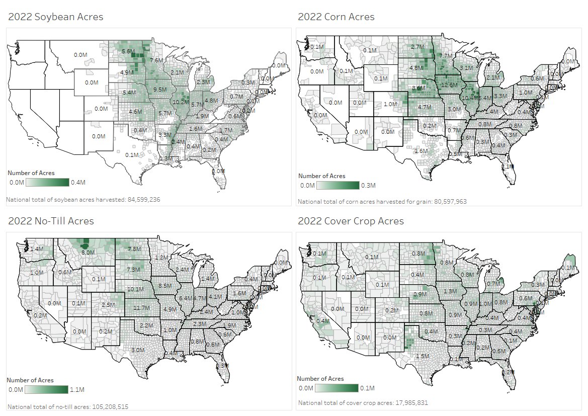 The 2022 Census of Agriculture had about 85 million harvested acres of soybeans and 81 million acres of corn harvested for grain. There were 105 million no-tilled acres of all crops in that year. The counties with the highest rates of no-till were in northern Montana, which tends to be spring wheat and barley area. Only about 18 million acres were planted to cover crops that year; this was due to environmental and growing season limitations that affect cover crops and the relatively high cost of implementation.