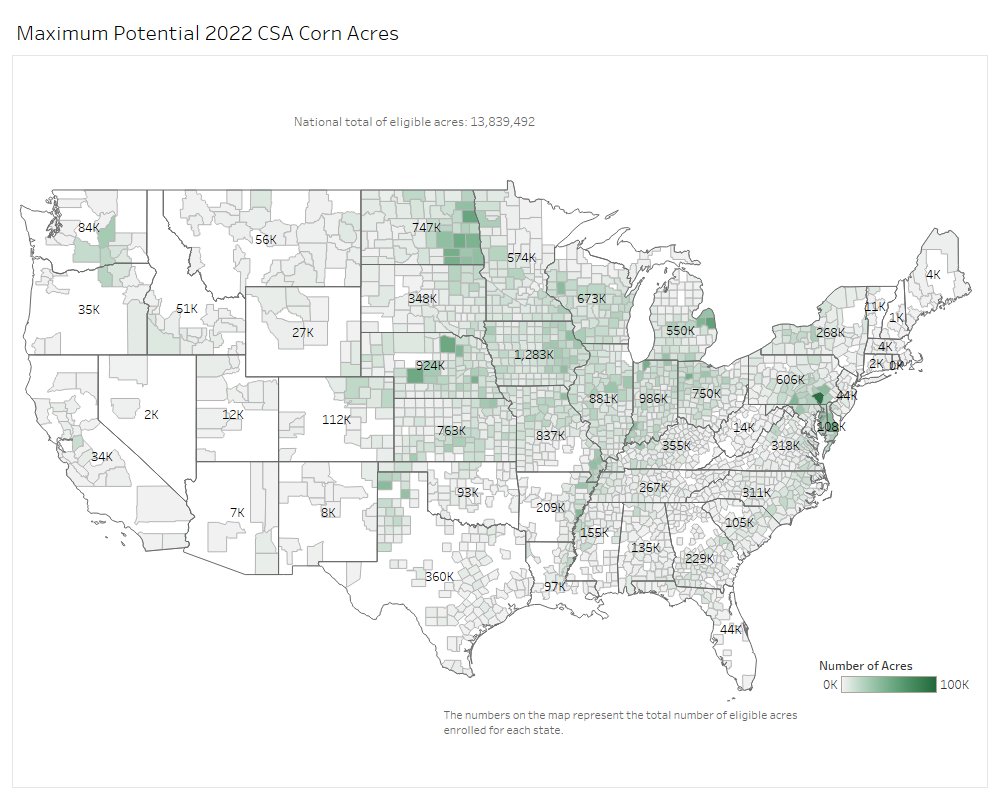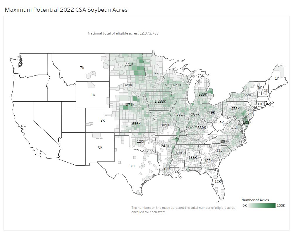 For cover crops only, both corn and soybeans would each receive 400,000 or more potential eligible acres. However, for no-till, both crops will gain significantly more potential CSA-eligible acres. Corn would have over 56 million potential eligible acres, while soybeans would be over 57 million.
