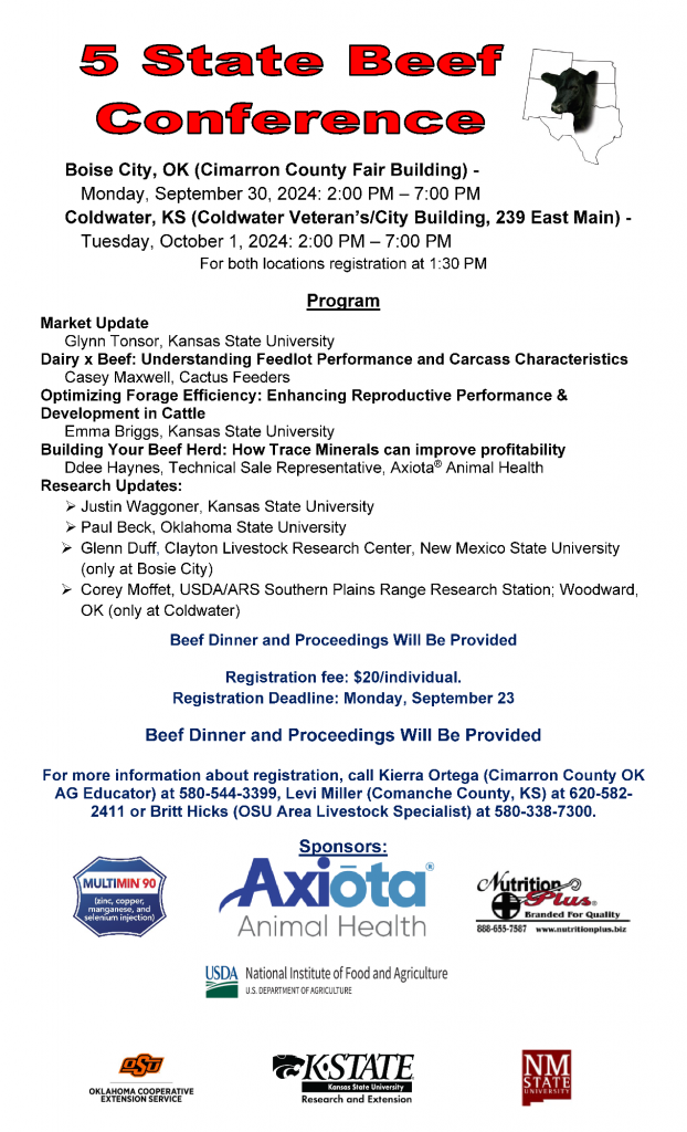 The Beef Extension teams of Oklahoma, Kansas, Colorado, New Mexico, and Texas have announced the dates and locations for the upcoming 5 State Beef Conference. The annual conferences cover topics important to beef cattle producers with locations rotating among the states each year.