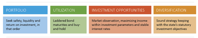 “Yields will continue to grow as the portfolio sheds the older investments and takes on the influence of the new rate range. Total portfolio yields are lower than current yields due to the laddered structure of the investments over a 3 year average.”–STATE TREASURER, TODD RUSS