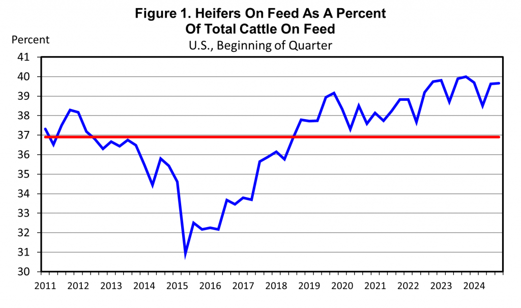 The quarterly inventory of heifers on feed was 4.6 million head, down 0.9 percent year over year. Heifers made up 39.7 percent of the total feedlot inventory on October 1, up slightly from the 39.6 percent in July. Heifers have averaged 39.5 percent of total feedlot inventories for the past ten quarters, since July 2022 and have been above the 15-year average of 36.9 percent since October 2018 (Figure 1).