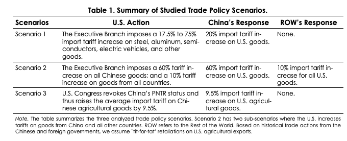 The outcome of the upcoming presidential election could reshape U.S. trade policy, directly impacting Southern U.S. agriculture. With its dependence on exporting commodities like soybeans, cotton, and poultry, the region faces uncertainty as potential policy shifts loom. Historically, Southern agriculture has been sensitive to changes in trade policies, as seen during recent trade conflicts like the U.S.-China trade war, which led to substantial income losses for farmers and ranchers across the region. Understanding how those new trade policy scenarios, as summarized in Table 1, might unfold is crucial for preparing Southern farmers and agricultural businesses for a turbulent period in global trade.