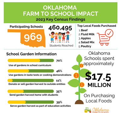In the fall of 2023, USDA asked all School Food Authorities (SFAs) to answer a comprehensive survey about their use of local food in school meals and the use of nutrition and agricultural education, edible school gardens, and other relevant farm to school activities in child nutrition program settings during the 2022-2023 school year. Farm to school is growing in Oklahoma with more than 870 schools serving local foods in the cafeteria.