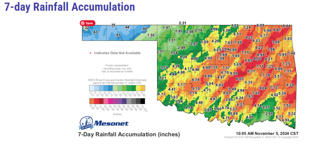 McManus detailed the rainfall amounts in various parts of the state saying that Northwest Oklahoma missed a lot of it, settling for only an inch or two of rain. Central Oklahoma, Northeast Oklahoma, and parts of East Central Oklahoma received 7 to 9 inches of rain.