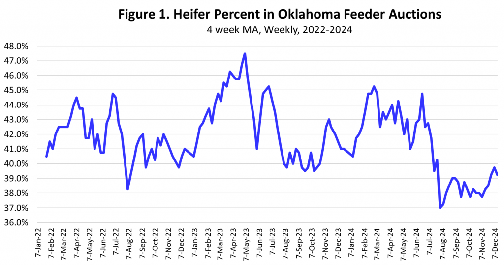 Although the total feeder auction volume has decreased relatively little this year compared to last, there is one change that could be significant. Figure 1 shows the reported heifer percentage of Oklahoma weekly feeder auction volume from 2022-2024.