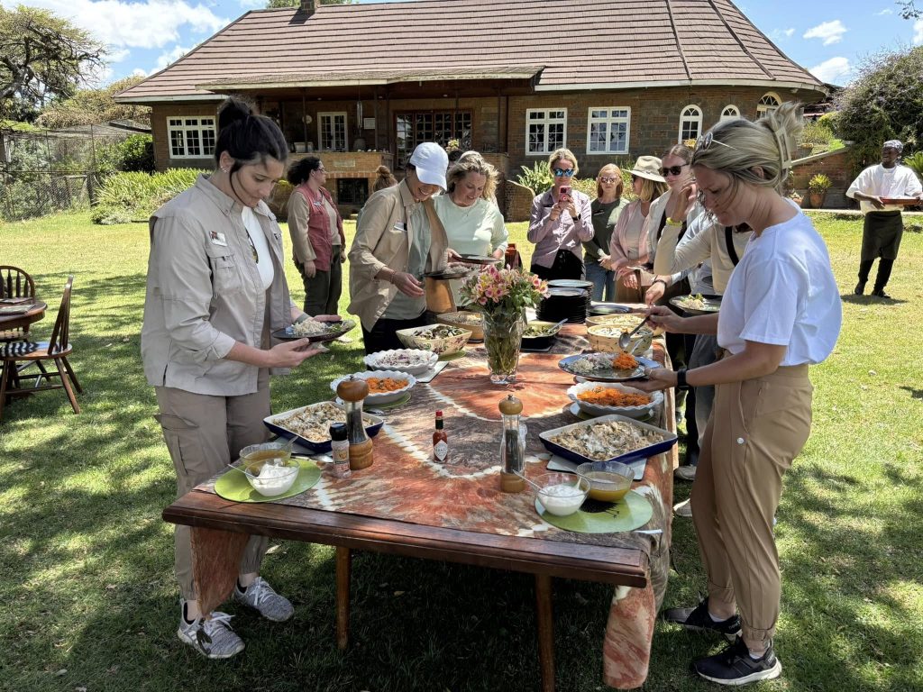 Midday- “The OALP visited Kenana Farm near Njoro where we met Bruce Nightingale. The Nightingale family have farmed in Kenya for many years. We enjoyed a delicious lunch outdoors hosted by Andrew (Bruce’s son) and Zoe Nightingale on the lawn in their stunning garden with lovely views across the Great Rift Valley.