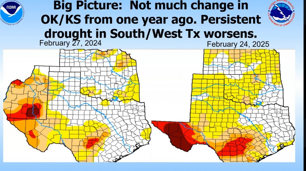 He referenced the devastating wildfires of February 2023, where 150,000 acres were burned in Northwest Oklahoma with drought ratings near zero. “You know, as good as things we’re looking right now for Oklahoma, the wildfire danger is just right around the corner. It’s always possible if you get the right conditions.”