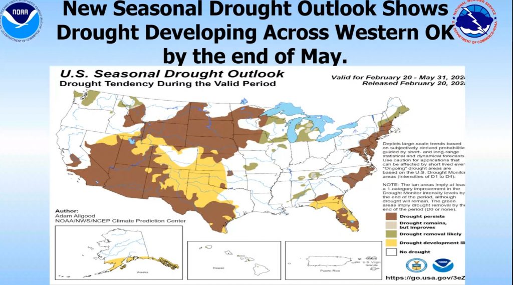 The Climate Prediction Center forecasts drought development across Western Oklahoma and West Texas between now and the end of May.