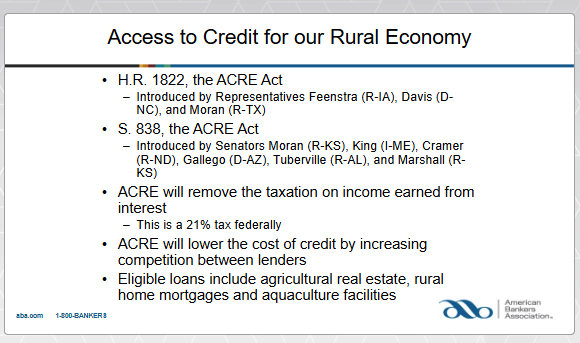 ABA is also promoting the ACRE Act, which aims to lower interest rates for farmers and ranchers. “ACRE will create more competition in the lending space and help lower interest rates for farmers and ranchers,” he explained.
