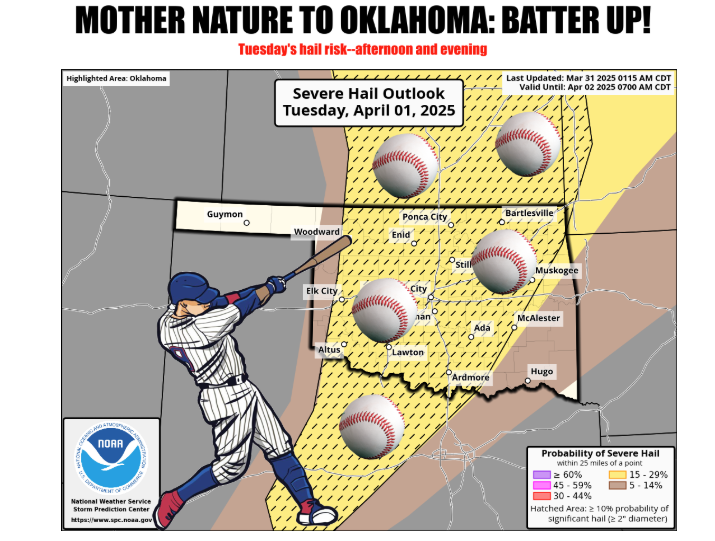 “Fresh off our the hail from Saturday night/Sunday morning, we have another POTENTIAL round of significant severe weather on the line for Tuesday,” McManus states, emphasizing the immediacy of the threat. He highlights the potential for large hail, noting, “Tornadoes? Sure, but the hail’ll could be what gets ya, putting knots on your noggin faster’n you can rub ’em.”