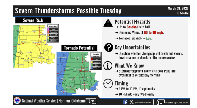 Oklahoma residents are urged to stay vigilant as the state faces the possibility of another round of severe weather this week, just days after a significant hailstorm. State Climatologist Gary McManus warns of potential tornadoes, large hail, and a high fire danger.