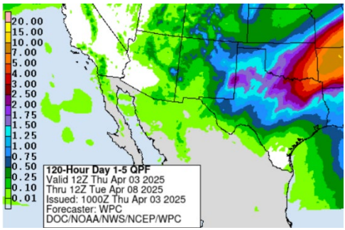 - Oklahoma Panhandle/Northwestern/Western Oklahoma: Rain in some areas combined with much higher surface air moisture will limit fuel receptiveness this morning. Outside of a brief period of possible elevated fire weather in the western Panhandle, limited fire occurrence is expected with greatly reduced new wildfire potential. In the western Panhandle where with temperature around 60°, increasing cloud cover and relative humidity values maybe tapping 22%; 1-hr fuel moisture may touch 5%. South winds 20-25 mph with some gusts approaching 35 mph will support a narrow window of active burning conditions where rangeland fuels exhibit head fire rates of spread +/-140 ft/min and flame lengths +/-9 ft prior to burning conditions rapidly declining.