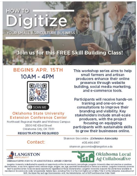 FREE Skill Building Class coming up next Tuesday, April 15 at the Oklahoma County OSU Extension Center in Oklahoma City! This class is hosted by Langston University and focuses on How to Digitize your Small Agriculture Business