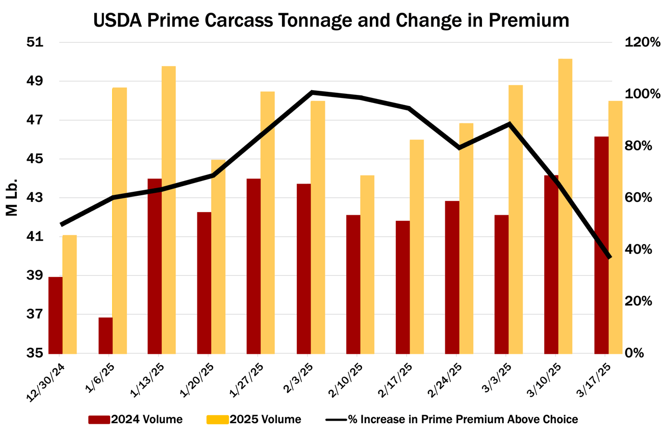 Combined Choice and Prime quality grade percentages recently touched a record-high 86.5% of fed cattle carcasses. USDA Prime has been the driver with the year-to-date number at 11% of fed cattle compared to 10% a year ago. Heavier carcass weights and the one percentage point increase in the Prime carcass share have netted a 10.8% increase in total Prime carcass tonnage. Even so, the Prime cutout premium over Choice has run 65% wider than a year ago in the last 14 weeks.