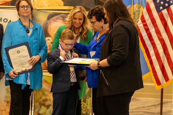 Thomas Clark, first grade student from Burlington, Oklahoma, examined his citation from Senator Pederson pretty closely! He was the Overall Early Childhood Winner for the AITC Contest.