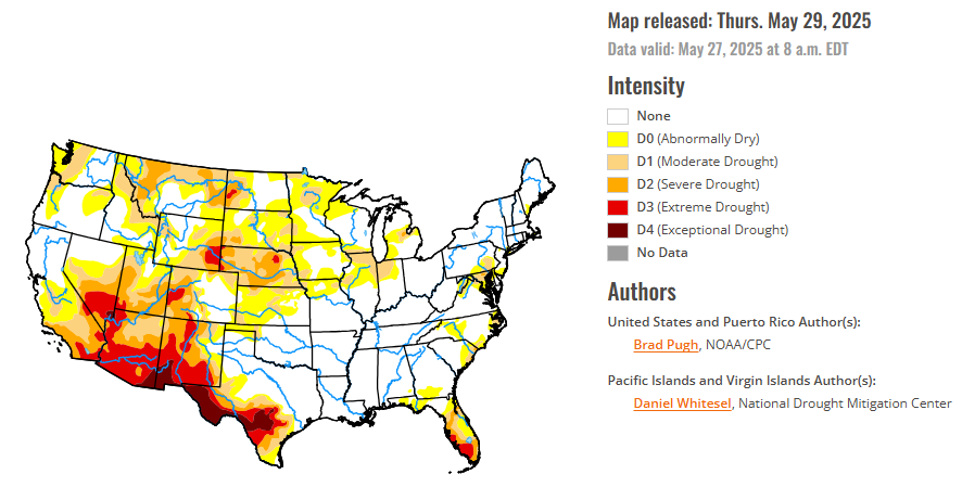 In the West, based on 6-month SPI, water-year-to-date (October 1, 2024 to May 26, 2025) precipitation deficits, and 28-day average streamflow, moderate drought (D1) was expanded to include more of southwestern Washington. Increasing 30 to 90-day precipitation deficits, low 28-day average streamflows, and declining soil moisture led to the introduction of D1 to parts of northwestern and northeastern Oregon. The 6-month SPI supported the expansion of severe drought (D2) coverage across southwestern Utah. Although precipitation was light this past week, SPIs dating back 120 days along with more favorable soil moisture indicators led to improvements across southwestern and eastern Montana. Conversely, in northwest Montana, D1 was degraded to D2 based on 120-day SPI and declining soil moisture. To the east of the Sierra Nevada Mountains, abnormal dryness (D0) was expanded to the south of Lake Tahoe due to drier-than-normal conditions since April.
