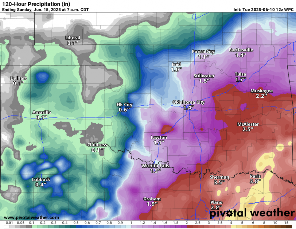In Tuesday’s mesonet ticker, McManus mentioned more rain on the way, which will elevate those lake levels even further. Ponca City may receive 1.1 inches, Kaw Lake is in the 2 – 3 inches range, and Lake Lugert-Altus may receive 0.1- 0.6 inches of rain from now until June 15 before summer temperatures really take over.