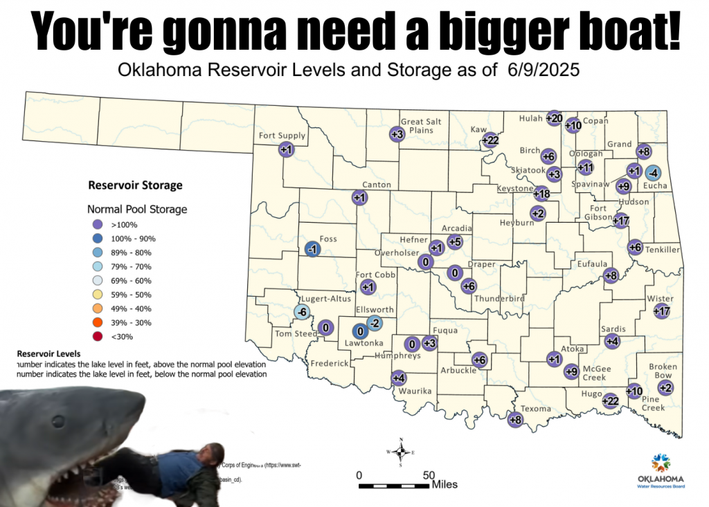“Those lakes, at least in some parts of the state, have a chance to go even higher after the next few days, starting tonight,” McManus said. Then, referencing the higher projected rain totals in the Southeast, he added. “Those rain chances have done the ‘Southeast Shuffle. ‘ Okies get so tired of – at least the NW half of the state’s Okies.”
