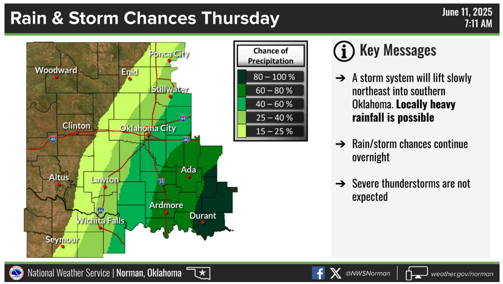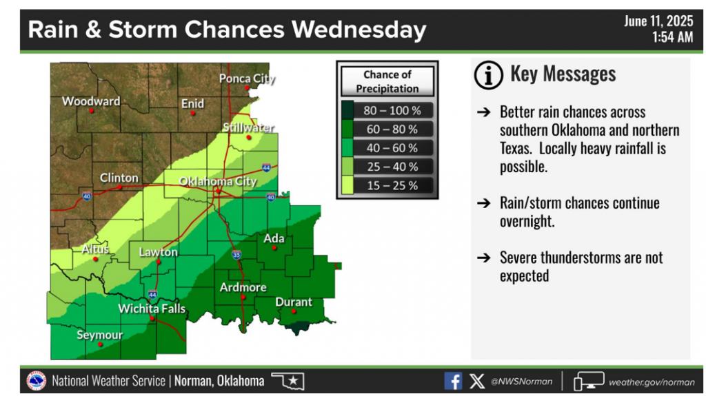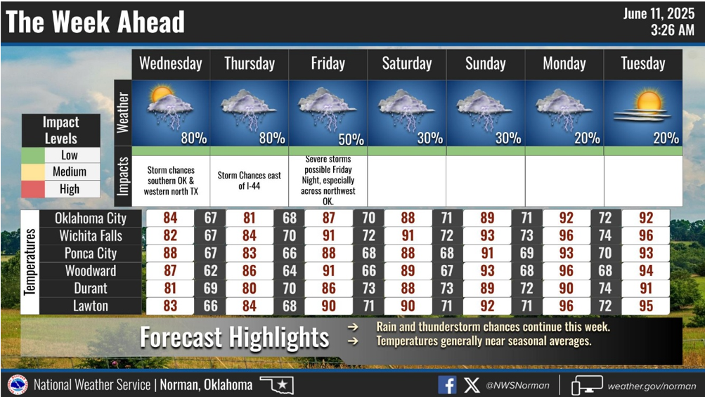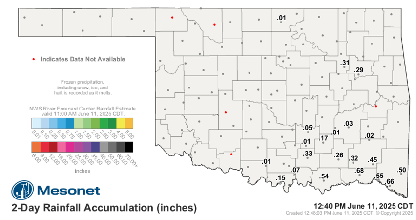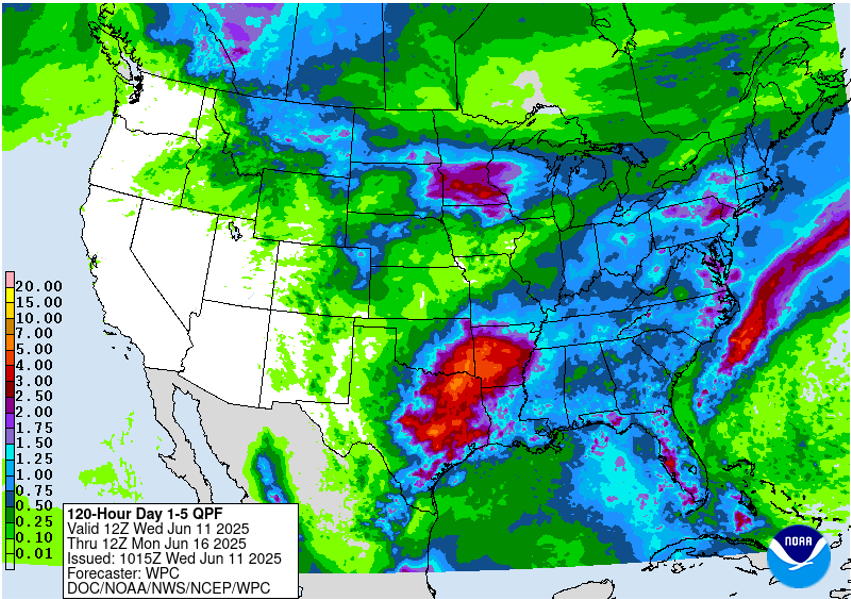 The Days 1-5 Precipitation Forecast is produced by the National Weather Service’s Weather Prediction Center for June 11-16, 2025.  See 2-Day Rainfall Accumulation (inches) measured by Oklahoma Mesonet.  Please note several places have high humidity and received large amounts of moisture over the past 5 days which has hindered harvest in many locations.