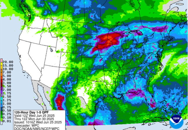 Oklahoma wheat harvest has been moving at a fast pace the last two days. Several producers and custom harvesters wrapping up in Southwest, Oklahoma. Great strides also have been made in central and far western regions of the state. Producers are cutting in all regions even in the North Central, I-35 corridor on the Oklahoma/Kansas line. (Producers continue to battle mud from heavy rains in Northern, Oklahoma from Kremlin to the Blackwell/Ponca City, Braman region. Mud is also giving producers challenges in the Afton and Miami area.) It should be noted several locations from all central regions to most northern regions have several fields that are partially harvested with producers and harvesters planning to come back for the wetter lower lying areas. Rain has also hindered progress on some of the dryland wheat areas in the Panhandle that was received on Monday evening. **Test weights across the state have dropped due to all the heavy rains last week, but statewide we are still looking at a 59 lb. per bushel average despite some lower test weights reported based on location and variety. Yields across the state are being reported from the mid 30’s to mid 50’s for the most part. Producers with management intensive plans have been reporting yields in the mid 60’s to low 80’s. Protein across the state averaging 11.1%. The Oklahoma Wheat Commission is calling harvest 55% completed as of today. The next harvest report will be published on June 30, 2025.