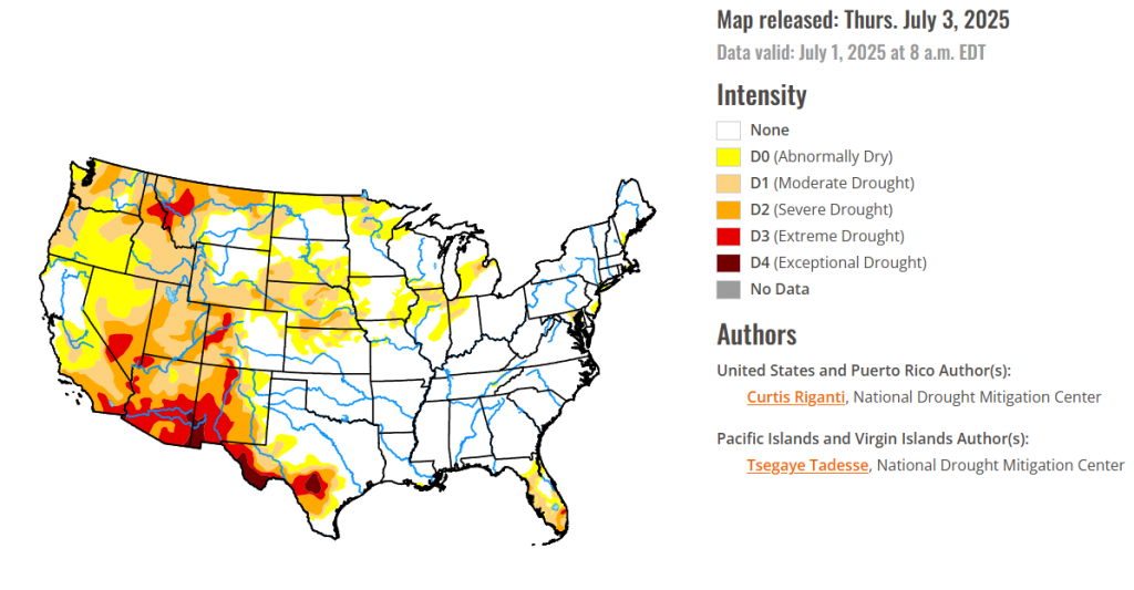 Severe drought or worse conditions remain at zero percent, unchanged since the week of May 29, 2025.