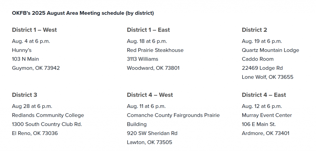 For questions about OKFB’s August Area Meetings, members can contact their field representative or the OKFB public policy department at (405) 523-2300.