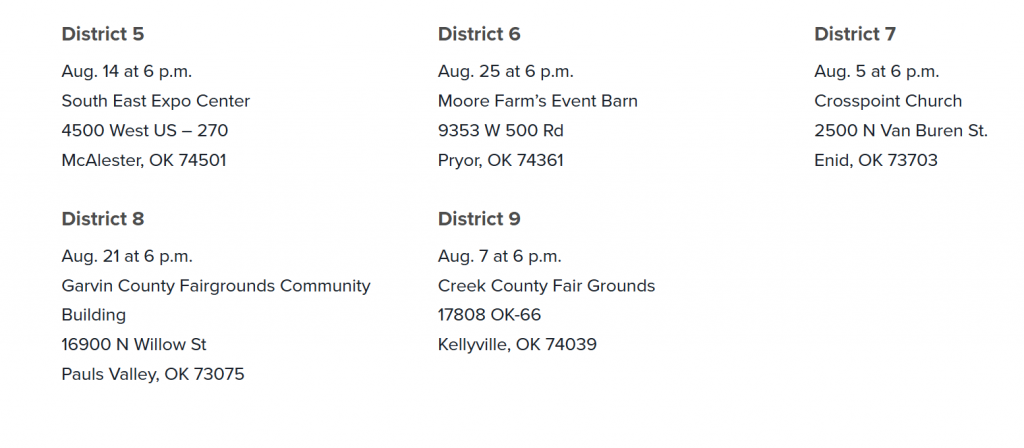 A total of 11 meetings will be held across all nine Farm Bureau districts. Each meeting begins at 6 p.m. and will include a meal. OKFB members can attend the area meeting that is most convenient for them.