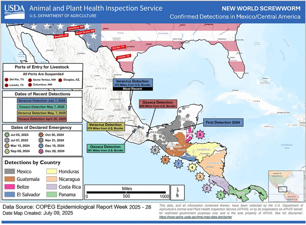 Yesterday, Mexico’s National Service of Agro-Alimentary Health, Safety, and Quality (SENASICA) reported a new case of New World Screwworm (NWS) in Ixhuatlan de Madero, Veracruz in Mexico, which is approximately 160 miles northward of the current sterile fly dispersal grid, on the eastern side of the country and 370 miles south of the U.S./Mexico border. This new northward detection comes approximately two months after northern detections were reported in Oaxaca and Veracruz, less than 700 miles away from the U.S. border, which triggered the closure of our ports to Mexican cattle, bison, and horses on May 11, 2025.