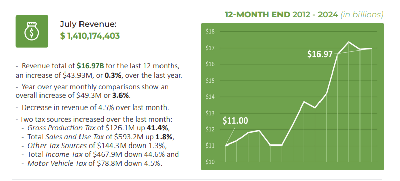 - Gross Production Tax (oil & gas): Rose 41.4% month-over-month and 50.6% year-over-year, reflecting strength in energy markets.