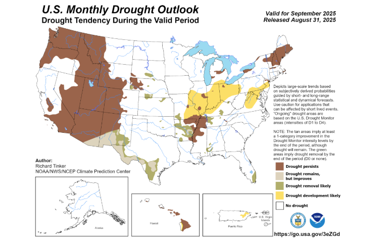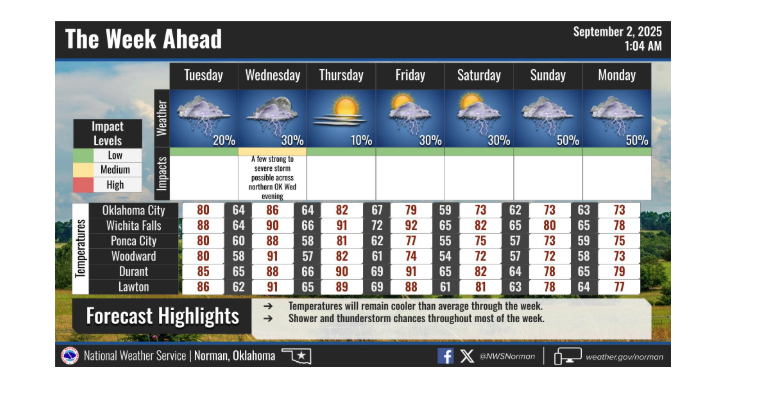 McManus said Oklahomans can expect a slow warm-up through the current week, but another “bigtime cold front” is forecasted for the upcoming weekend, along with more rain. The Climate Prediction Center’s outlook for September suggests a likely chance of above-normal precipitation for the northwestern two-thirds of the state, which should continue to help improve drought conditions.