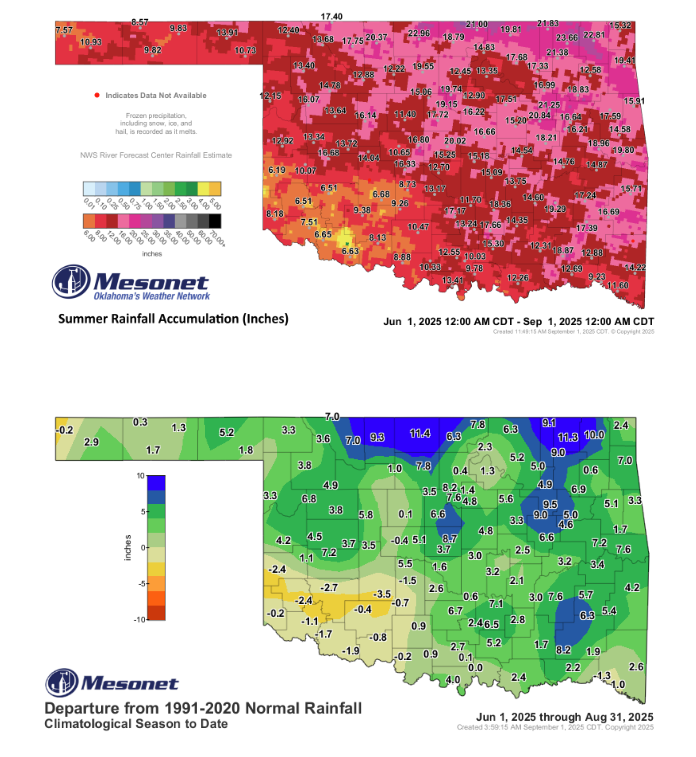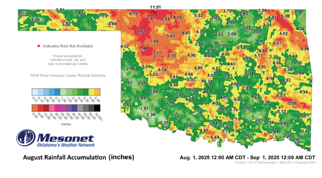 A significant amount of rain accompanied the unseasonal cold. The statewide average rainfall from August 25–31 was 2.58 inches, making it the second-wettest such period on record, falling just short of the 2003 record. For the entire month, August ranked as the 21st-wettest on record with a statewide average of 4.32 inches. Northwest Oklahoma saw the heaviest downpours, with some areas receiving 4 to 6 inches above normal rainfall. The May Ranch Mesonet site led the state with an impressive 11.01 inches.