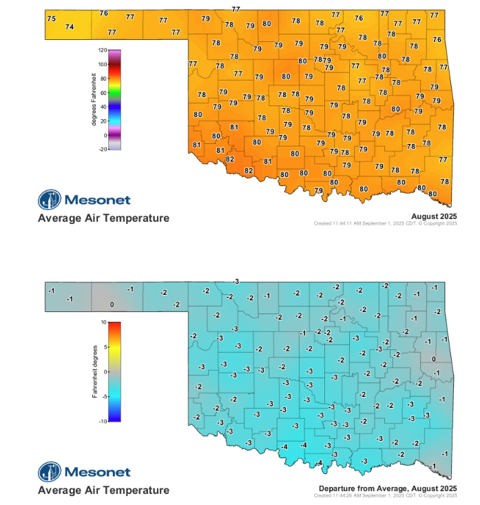 The last seven days of August were the coolest on record for that period in Oklahoma history. With a statewide average temperature of just 71.4 degrees, this stretch surpassed the previous record of 72.5 degrees set back in 1946. This cool-down resulted in numerous records for daily low maximum temperatures. Several long-term weather sites even saw their lowest maximum temperature ever recorded for the month of August, including: